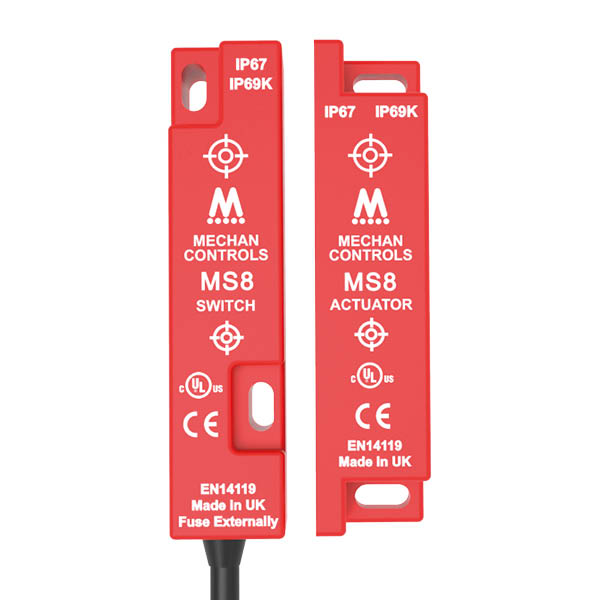 Housing:Red ABS, Resin EncapsulatedContacts:2NO, 2NO + 1NC (with door open)Contact Rating:300mA 24VDCConnection Type:Pre-Wired Cable, 6 coresOperating Distance:30mm ON / 50mm OFFIngress Protection Rating:IP67 and IP69KThe MAGNASAFE MS8 non-contact safety switches are an industry standard, slim-line, space saving housing made from Red ABS. Fully encapsulated, the MS8 safety switches have been designed with a larger than standard switching distance to ensure easy to install, tolerant to misalignment. The non-contact operation has a 30 – 50 mm switching distance helping to ensure a long and trouble free operating life where guarding alignment is an issue.Request Quote